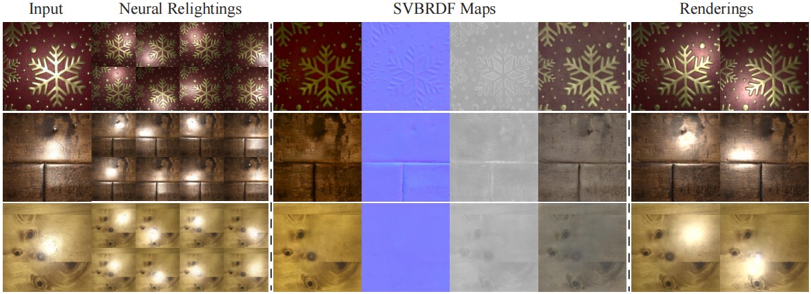 论文简介:基于单张图像的材质重建是真实感渲染研究的热点问题之一,输入图像中的强高光会显著干扰材质重建结果,导致重光照时产生高光burn-in伪影。针对上述挑战,本文针对单张图像,创造性地提出了背景-高光解耦的材质特征提取方法,为重光照提供更稳定的引导。该方法基于shuffle策略的背景一致性模块提取稳定的背景,并结合镜面高光先验重用策略提取高光信息。同时,以IP-Adapter的形式将相机、光照位置条件注入扩散模型,最终实现背景稳定且无高光burn-in问题的重光照生成。进而与任意多图输入的材质SVBRDF估计器配合,该方法可生成不受强光影响的高质量、高分辨率SVBRDF maps。实验证明,该方法在真实数据和合成数据上均表现优异。